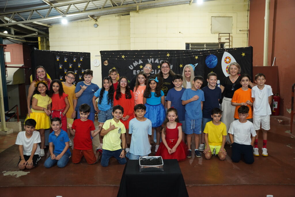 Crianças do Colégio ESCALA Bilíngue no palco da escola se divertindo em uma apresentação